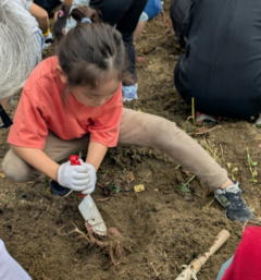 | 庭の畑でお芋掘りをしました。子どもも大人も協力してくださり、たくさんの収穫がありました。 みんなでわけ合って充分な量を持ち帰りました。 |